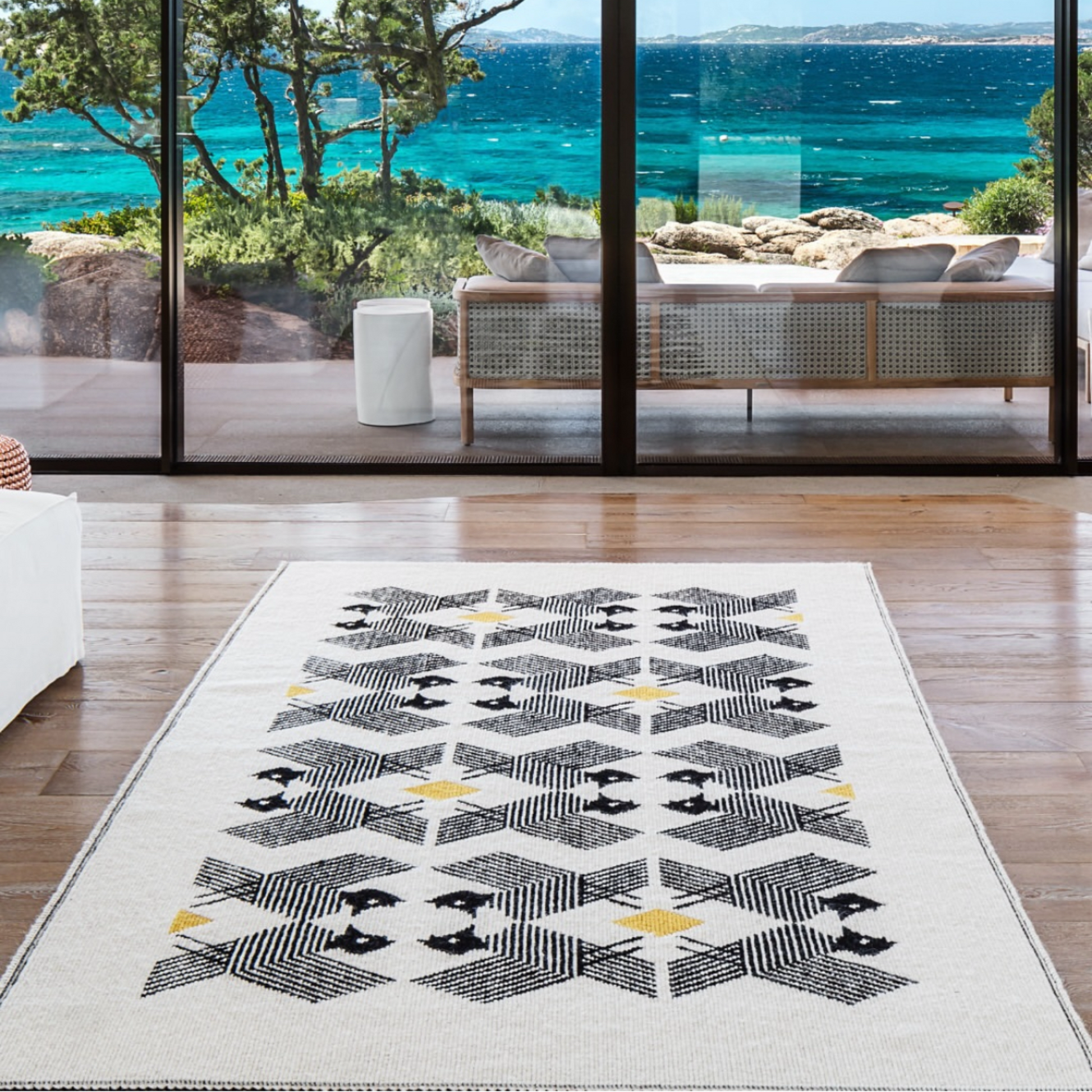 Un volatile stilizzato dà vita a un pattern romboidale nero e giallo su sfondo di bianco sporco naturale.